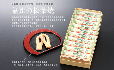 氣比乃松葉焼は、敦賀の名勝日本三大松原『気比の松原』の松葉を象った、胡麻の風味豊かな手焼き煎餅です。