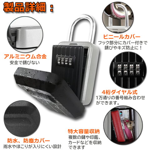 製品仕様:パッケージ:キーボックスx1、日本語説明書x1、ゴム栓x4、ネジx4最初のパスワード:0000材質:アルミニウム合金重量:約500g商品サイズ:高185mm(フック部分込み)×幅85mm×奥行41.5mm内部サイズ:77mm×92mm×26mm適用場合:住宅、オフィス、ジム、工場などの鍵の保管