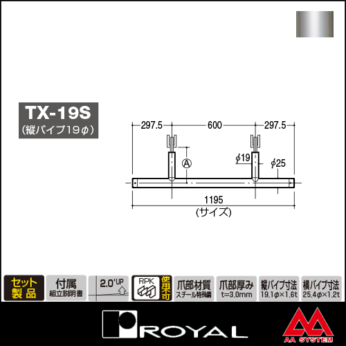 商品名 ロイヤル Tクロスハンガー 19φ TX-19S-300 1195mm クローム 品番 ROYAL-TX-19S-300C サイズ 全巾 1195mm ブラケット芯-芯 600mm A寸法:300mm パイプ径 横パイプ 25.4φ x 1.2t 縦パイプ 19.1φ x 1.6t 角度 2°UP 材質 スチール製 表面 クロームメッキ 付属品 組立説明書が付属します 納期 通常1〜2営業日ほどで発送可能です 返品・交換 こちらの商品は返品・交換が不可となります 備考 ・この商品はセット製品です ・RPK(ブラケットキーパー)の使用はできません
