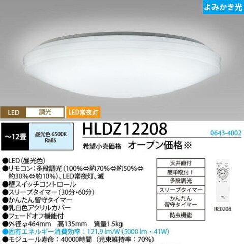 ●メーカー : ホタルクス ●形番 : HLDZ12208 ●適応畳数 : 12畳用 ●LED(昼光色) ●リモコン : 多段調光(100%⇔約70%⇔約50%⇔約30%⇔約10%) LED常夜灯、滅 ●壁スイッチコントロール ●スリープタイマー(30分・60分) ●かんたん留守タイマー ●乳白色アクリルカバー ●フェードオフ機能付 ●外径φ464mm 高135mm 質量1.5kg ●固有エネルギー消費効率 : 121.9lm/W(5000lm 41W) ●モジュール寿命 : 40000時間(光束維持70%)LEDシーリングライト 調光モデル(かんたん留守タイマー付) LEDシーリング調光モデルにかんたん留守タイマーをプラス。