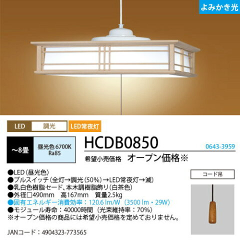 ●メーカー : NEC ●形番 : HCDB0850 ●シリーズ : LIFELED'S ●適応畳数 : 8畳用 ●光源色 : 昼光色 ●相関色温度 : 6700K ●平均演色評価数 : Ra85 ●定格光束 : 3500lm ●定格消費電力 : 29W ●固有エネルギー消費効率 : 120.6lm/W ●モジュール寿命 : 40000時間 ●光束維持率 : 70% ●制御機能 : プルスイッチ:全灯→調光(50%)→LED常夜灯→滅 ●取付方法 : 簡単取付 ●セード : 乳白色樹脂 ●本木調樹脂飾り(白茶色) ●外径 : 490mm ●高さ : 167mm ●質量 : 2.5kg ●コード吊 ●プルひも : 茶紐/薄茶筒型LEDペンダントライト LIFELED'S(ライフレッズ) 一般家庭などで幅広く使用されているスタンダードモデルです。