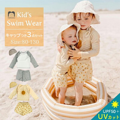\9/3まで5%OFF/ ベビー 水着 男の子 キッズ キャップつき上下3点セット UV セパレート 女の子 子供 ジュニア かわいい ベビースイミング 80cm 90cm 100cm 110cm 120cm 130cm ラッシュガード スイムウェア スイムパンツ 海プール ビーチ 紫外線対策