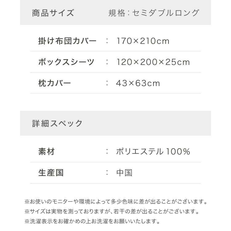 ●敷布団用3点セット【材質】ポリエステル100%【サイズ】掛布団カバー…:170×210cm/敷布団カバー:125×215cm枕カバー:43×63cm【生産国】中国●ベット用3点セット【材質】ポリエステル100%【サイズ】掛布団カバー…:170×210cm/ボックスシーツ:120×200×25cm枕カバー:43×63cm【生産国】中国※洗濯表示をご参考の上お洗濯をお願いいたします【商品の注意点】こちらの商品はサイズ規格がセミダブルロングとなっております。